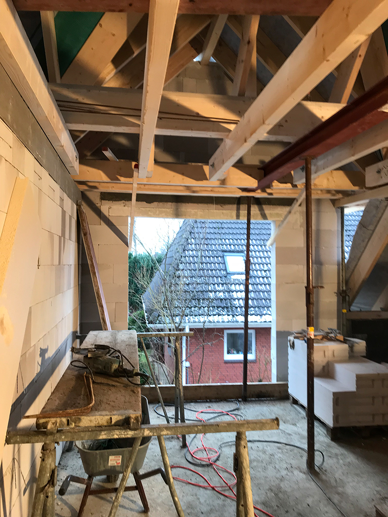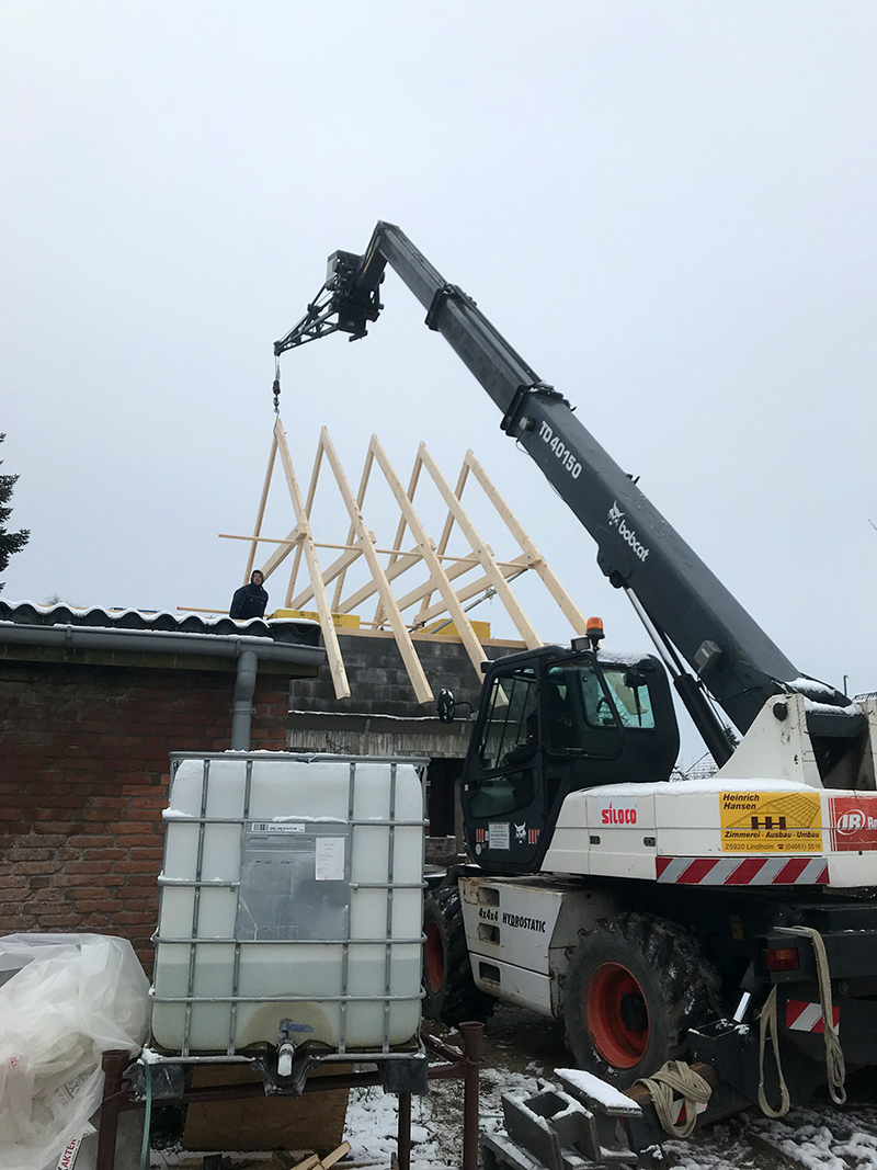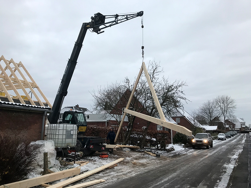Als Beispiel sehen Sie unten eine Dachaufstockung in Wanderup. Den Ablauf für Richtarbeiten in Niebüll. Und unten etwas besonderes: Ein Neubau der Zuschauer-Tribüne in Risum-Lindholm. Ein Neubau des Kindergartens in Lindholm. Sowie einige Beispiele von erstellten Dachvarianten.